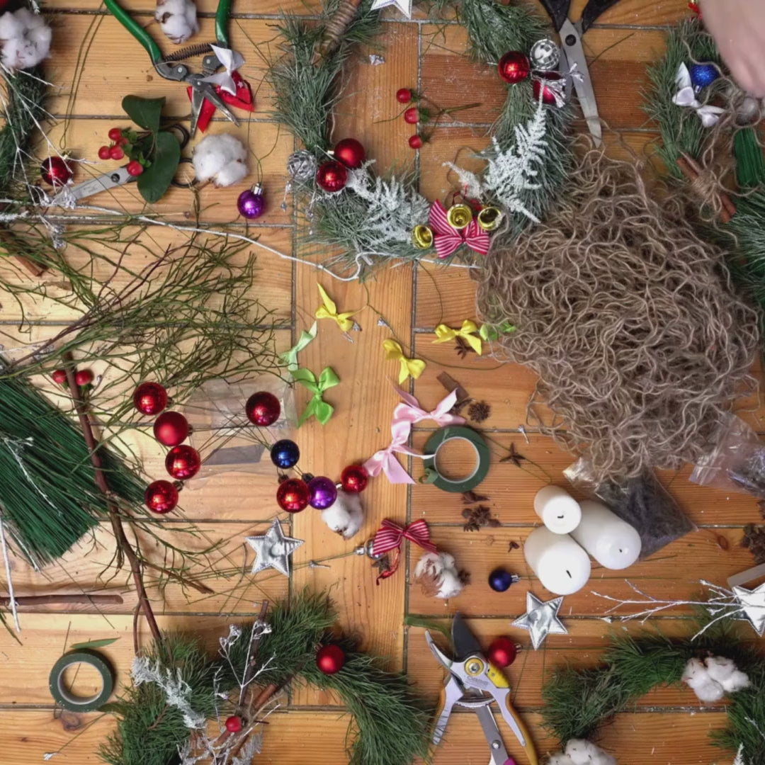 All materials (grapevine base, fresh + dried botanicals, bobbles, floral wire, ribbon)